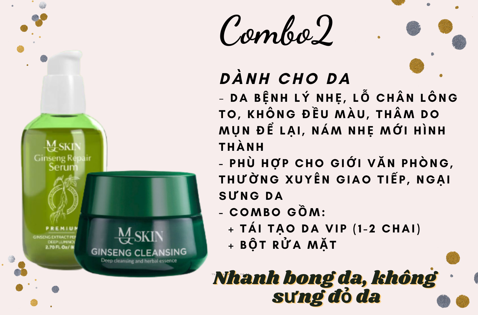 + Thay Da Nhân Sâm Không Sưng MQskin với 80% lượng nhân sâm, chứa dưỡng chất có khả năng giúp chống lão hóa da, khôi phục làn da căng mướt.