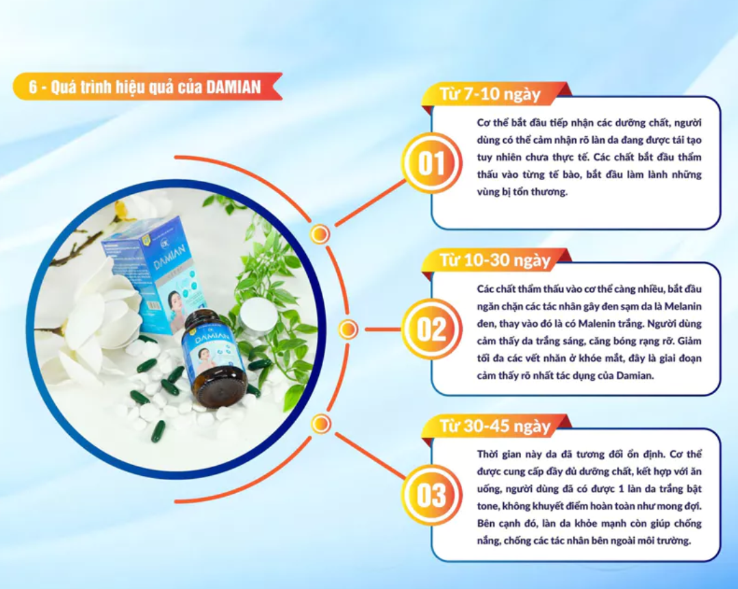 Hiệu quả nhanh hay chậm tùy thuộc vào cơ địa cũng như làn da của mỗi người. Viên uống trắng da Damian không cho kết quả ngay lập tức. Thông thường, cần sử dụng liên tục trong vài tháng để thấy sự thay đổi rõ rệt.