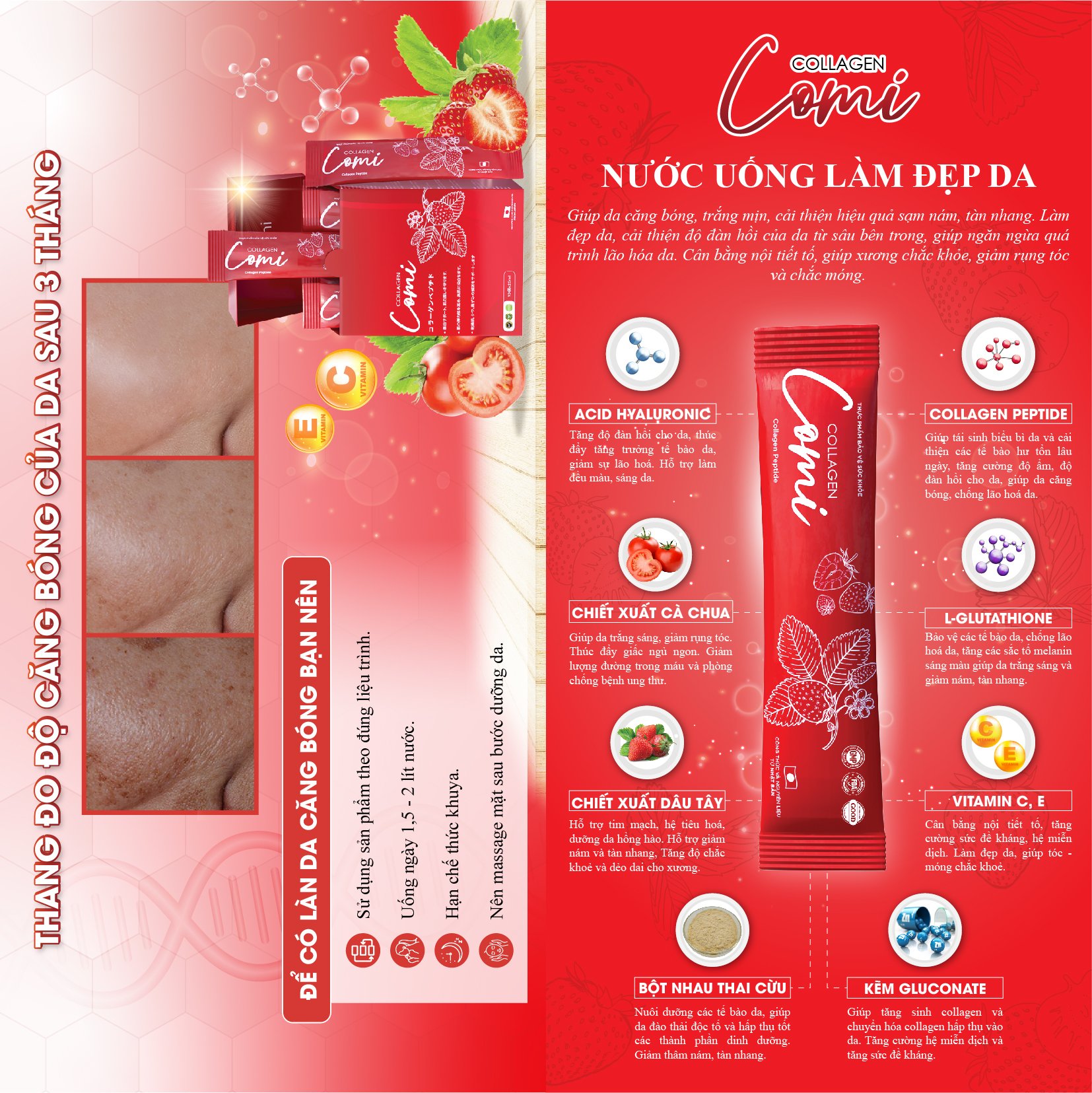 Nước Uống Collagen Comi Nhật Bản được ứng dụng công nghệ tách chiết collagen thủy phân độc quyền từ Nhật Bản, thành phần là sự kết hợp chiết xuất dâu tây, cà chua, vitamin C, E,…
