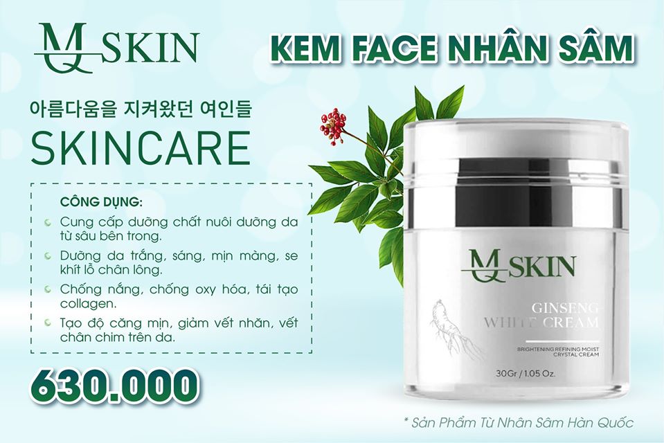 - Sử dụng kem Face nhân sâm MQskin giúp bổ sung collagen cho da mặt, cấp ẩm và dưỡng da căng bóng mịn màng.
