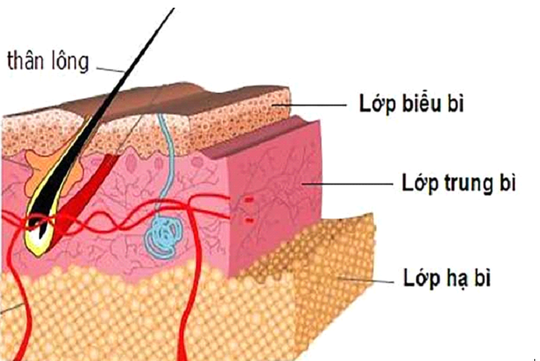Da cấu tạo từ 3 lớp BIỂU BÌ → TRUNG BÌ → HẠ BÌ, đến MẠCH MÁU